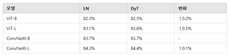 ImageNet-1K(Deng 외, 2009) 분류 작업에서 Vision Transformer(ViT)(Dosovitskiy 외, 2020)와 ConvNeXt(Liu 외, 2022) 모델을 "Base" 및 "Large" 크기로 학습하였다. 두 모델은 각각 attention(ViT)과 convolution(ConvNeXt)이라는 서로 다른 연산 방식을 사용하며 널리 쓰이는 모델이다. 실험 결과는 표 1에 나타냈다. DyT는 모든 아키텍처와 모델 크기에서 LN과 비슷하거나 약간 더 나은 성능을 보였다. 추가로 ViT-B와 ConvNeXt-B 모델의 훈련 손실(training loss) 그래프를 그림 5에 나타냈다. 두 그래프는 DyT와 LN 모델이 매우 유사한 수렴 경향을 보임을 나타낸다.