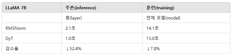 DyT는 추론과 훈련 모두에서 상당한 시간 단축 효과를 보였다.