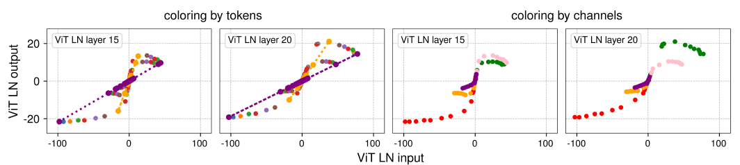 - 왼쪽 두 패널: 같은 토큰(같은 색)의 점들은 채널별로 직선을 형성한다. 이는 LN이 각 토큰의 채널 방향으로 선형 연산을 수행하기 때문이다. 그러나 모든 토큰을 함께 나타내면 이 직선들은 tanh 형태의 비선형 곡선을 형성한다.