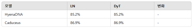 장거리 DNA 서열 모델링에서 HyenaDNA(Nguyen 외, 2024), Caduceus(Schiff 외, 2024)를 사용하였다. DyT는 표 6에서 LN과 동등한 성능을 보였다.
