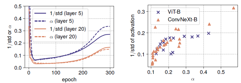 (오른쪽 패널) 학습이 끝난 두 모델(ViT-B, ConvNeXt-B)의 최종 α\alpha 값을 입력 활성값의 1/std 값과 비교했을 때, 두 값 간의 강한 상관관계가 나타난다.