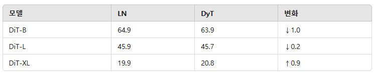 Diffusion Transformer(DiT, Peebles와 Xie, 2023)를 ImageNet-1K에서 크기(B, L, XL)에 따라 학습하였다. DiT에서는 LN의 아핀 파라미터가 클래스 조건부 처리를 위해 사용되므로, DyT 실험에서도 이를 유지한 채 정규화 연산만 tanh(αx) 함수로 대체하였다. 평가 지표는 표준 ImageNet 기준 배치를 이용한 Fréchet Inception Distance(FID)이며, 결과는 표 3에 나타냈다. DyT는 LN 대비 유사하거나 개선된 FID를 보였다.