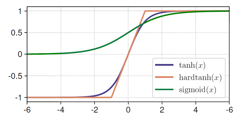 그림 7: 세 가지 비선형 압축(squashing) 함수(tanh, hardtanh, sigmoid)의 곡선. 모든 함수는 입력을 유한한(bounded) 범위로 압축하지만, DyT 층에 사용할 때 tanh가 가장 좋은 성능을 달성하였다. 이는 tanh 함수의 매끄러운(smoothness) 특성과 0을 중심으로 하는(zero-centered) 특성 때문일 가능성이 있다.