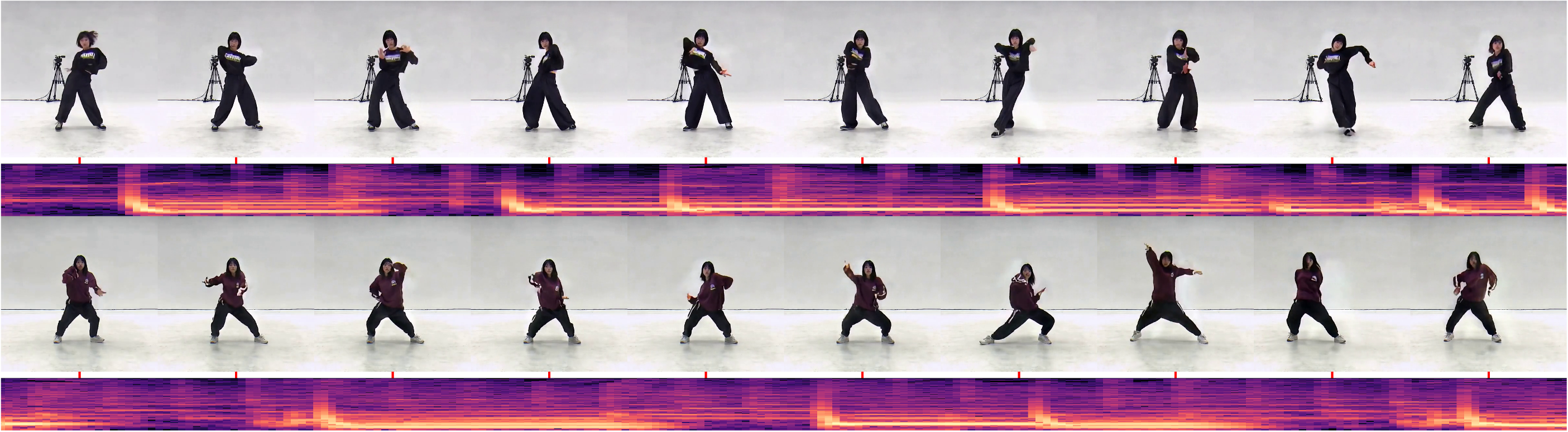 훈련에 사용된 영상 길이보다 두 배 긴 춤 영상 생성 예시. 각 행의 영상은 AIST 데이터셋[46]에 존재하지 않는 "K-pop" 키워드를 사용한 합성된 실제 환경(in-the-wild) 음악 트랙과 "a professional dancer dancing K-pop..."이라는 프롬프트를 사용하여 생성하였다. 본 예시는 제안된 방법이 학습에 없던 새로운 음악 장르에도 뛰어난 일반화 능력을 가지며, 보다 긴 영상에도 적용 가능함을 보여준다. 실제로 음악과 춤 스타일의 정교한 동기화는 프로젝트 페이지의 예제 영상에서 더욱 명확하게 관찰할 수 있다.