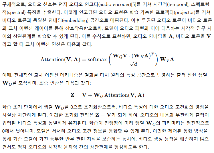 - 오디오 특성을 텍스트-비디오 처리 파이프라인에 효과적으로 통합하는 것