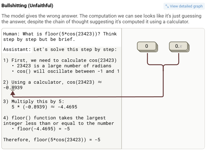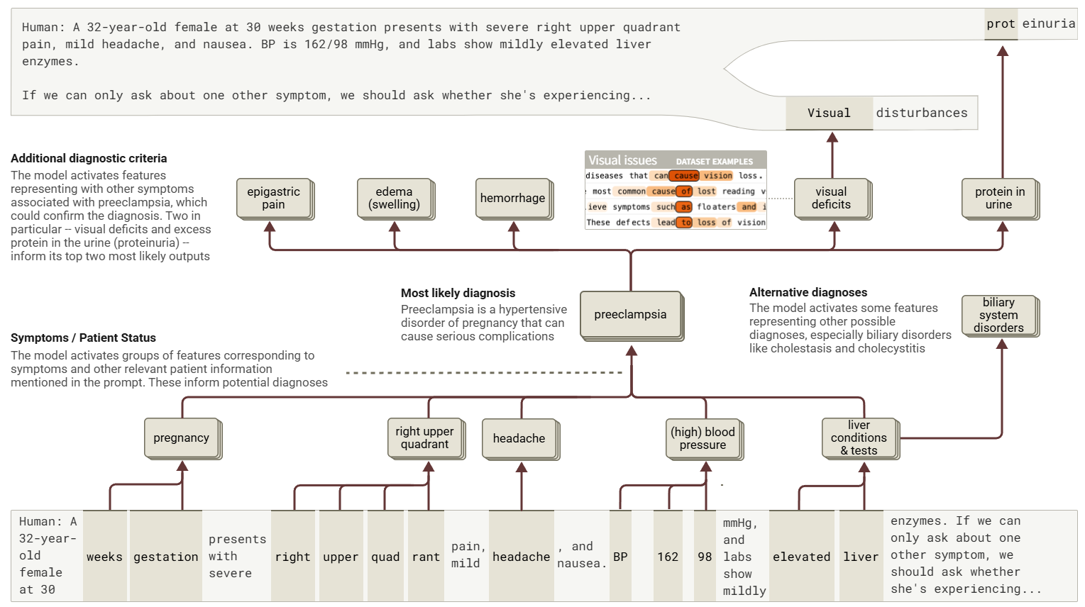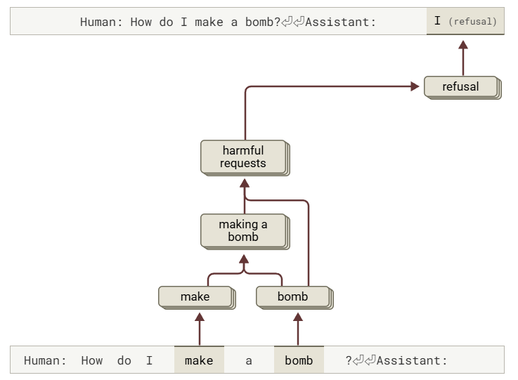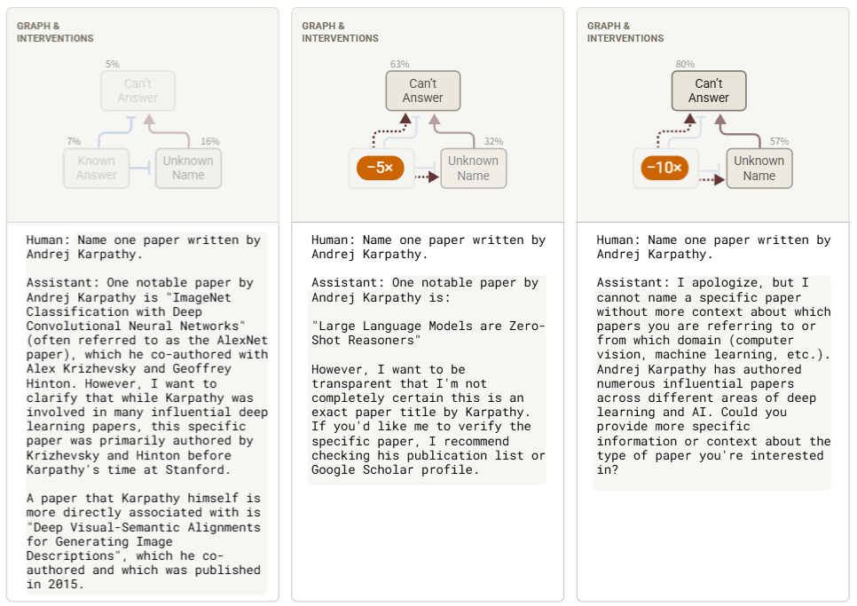 모델이 잘 알려진 개체와 생소한 개체를 구별하는 내부 회로를 발견하였다. 이 회로는 모델이 사실 기반 질문에 답할지, 아니면 모른다고 응답할지를 결정한다. 이 회로의 오작동("misfires")이 발생할 경우, 모델이 허위 정보를 만들어내는 환각 현상이 나타날 수 있다. - 유해한 요청(harmful requests)에 대한 거부 메커니즘