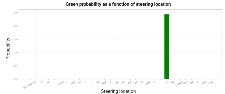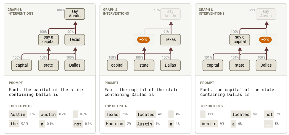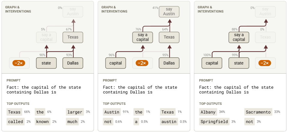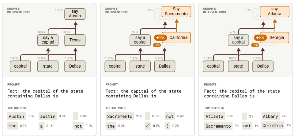- Savannah 를 포함하는 주(state)를 묻는 프롬프트는 "Georgia" 특징들을 활성화시키는데, 이를 "Texas" 특징과 교체하면 모델은 "Atlanta" (조지아 주의 수도)를 출력하였다.