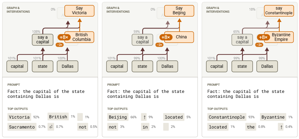 - Vancouver 를 포함하는 캐나다 주(province)를 묻는 프롬프트는 "British Columbia" 특징을 활성화시키며, 이를 "Texas" 특징과 교체하면 모델은 "Victoria" (브리티시컬럼비아 주의 수도)를 출력하였다.