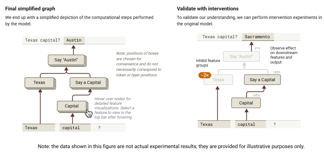 그래프는 우리의 대체 모델이 실제로 다단계 추론(multi-hop reasoning) 을 수행하고 있음을 나타낸다. 다시 말해, 모델이 "Austin"이라고 말하기로 결정한 것은 몇 가지 중간 계산 단계(Dallas → Texas, Texas + capital → Austin)로 구성된 추론 체인(chain)에 기초한다는 것이다. 그러나 이 그래프는 실제 메커니즘을 상당히 간략화한 것으로, 독자는 보다 포괄적인 시각화를 통해 기저에 존재하는 복잡성을 탐구해볼 것을 권장한다.