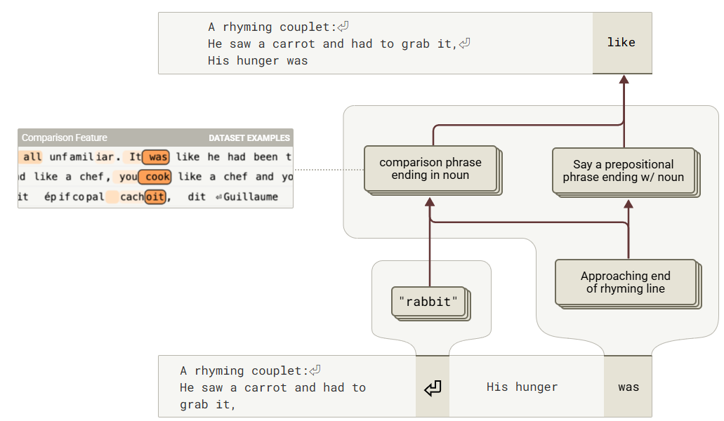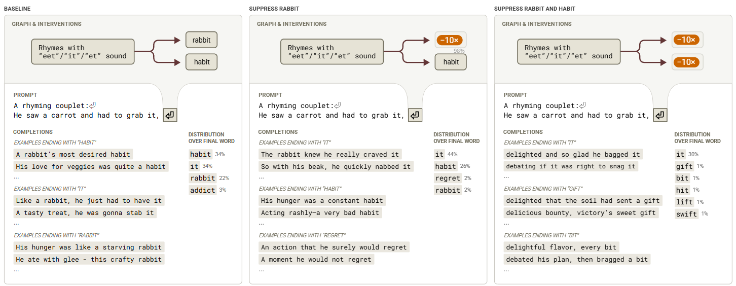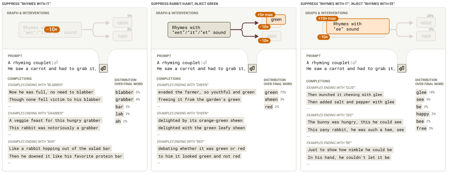 간단한 예시로서, 모델이 내부적으로 두 단계("two-hop") 추론을 수행하여 "댈러스를 포함한 주(state)의 수도는 오스틴"이라고 판단하는 과정을 제시한다. 여기서는 "텍사스"라는 중간 단계를 모델이 내부적으로 어떻게 표현하고 조작할 수 있는지를 보여준다. - 시(詩) 생성 과정에서의 계획(planning)