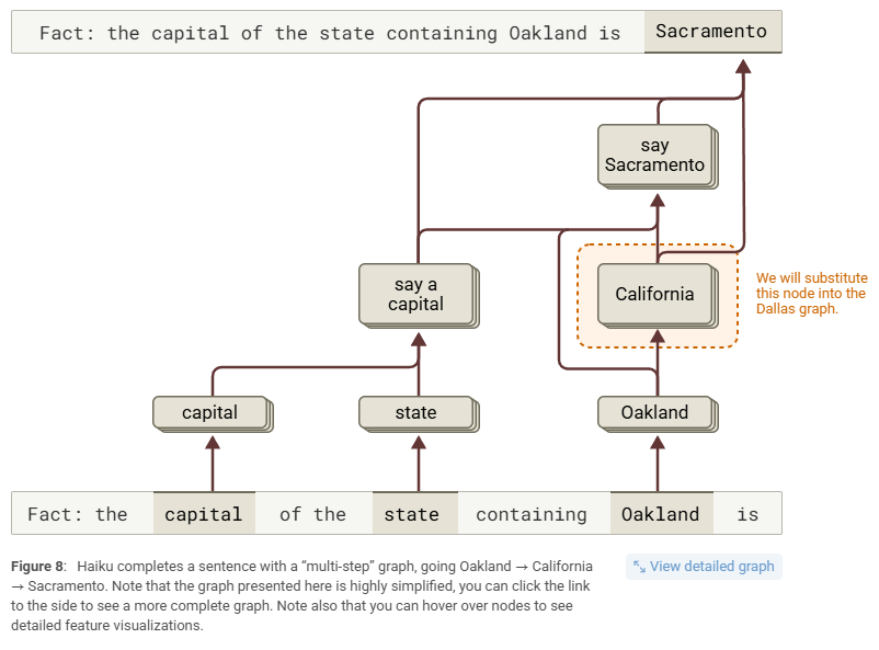 그림 8:Haiku 모델은 "Oakland → California → Sacramento"의 다단계(multi-step) 그래프를 통해 문장을 완성한다. (아래 그래프는 단순화된 것이며, 보다 완전한 그래프는 측면의 링크를 클릭하여 확인 가능하다. 각 노드 위에 마우스를 올려 상세한 특징 시각화를 볼 수도 있다.)