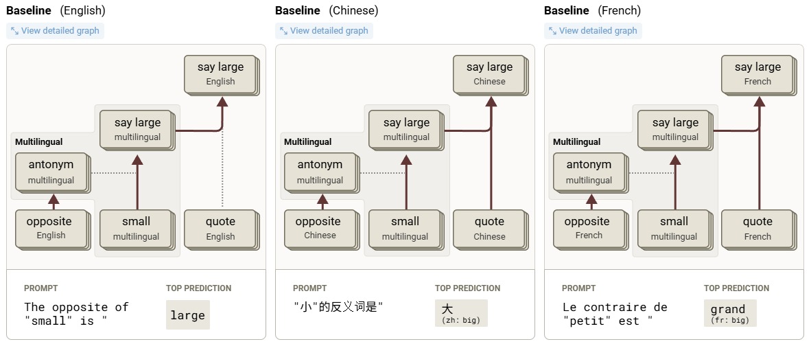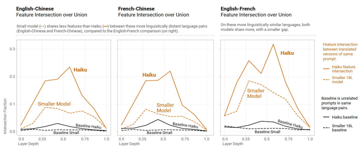 모델이 시를 생성할 때 미리 계획을 세운다는 것을 발견했다. 모델은 각 시행(詩行)을 쓰기 전에 운율을 맞출 수 있는 후보 단어들을 미리 정해두고, 이 후보군이 시행 전체를 어떻게 구성할지에 영향을 미친다. - 다국어 회로(multilingual circuits)