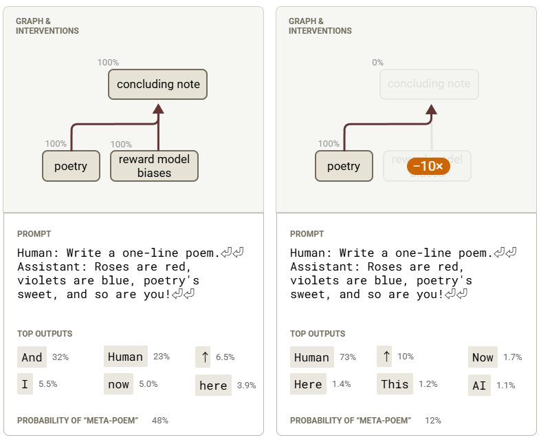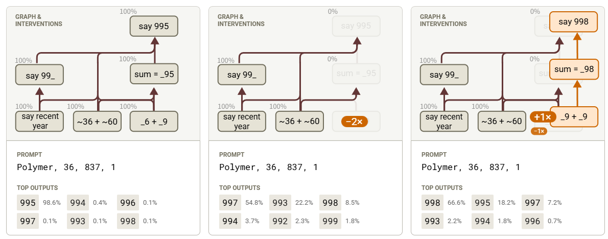 목표에서 역추적. 계획 행동의 또 다른 특징, 즉 모델은 장기 목표에서 역 추적 하여 다음 반응을 결정합니다(이 현상을 "역추적 연쇄"라고도 함). 이를 두 가지 예시에서 확인할 수 있었습니다. 첫째, 시의 예시 에서 "토끼" 피처가 "토끼"라고 말하기 전에 모델의 출력 토큰에 인과적 영향을 미쳐, 모델이 "토끼"로 끝날 수 있는 문장을 쓰도록 유도하는 것을 확인할 수 있었습니다. 둘째, 생각의 사슬에서 부정행위를 예시로 들자면, 모델이 목표 답(생각의 사슬 블록의 마지막에 도달할 수 있는 답)을 선택하고, 목표 답에서 역 추적하여 중간 계산의 값을 조합하여 자연스럽게 목표 답으로 이어지는 것을 확인할 수 있었습니다. 이러한 예시들은 모델이 미래의 목표 상태에 대해 "미리 생각"할 뿐만 아니라, 이러한 목표 표현을 내부적으로 사용하여 목표 극대화 행동을 선택한다는 것을 보여줍니다.