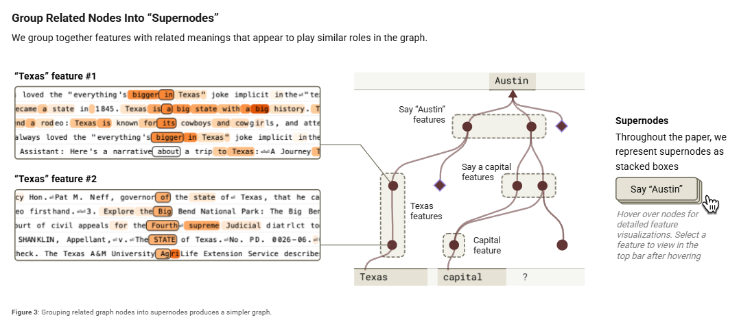 - 또한 우리는 특정 도시("Dallas" 또는 "Austin")가 아닌 텍사스(Texas) 주(state)와 관련된 다양한 맥락을 나타내는 여러 특징들을 발견했다. 각각의 특징들이 구체적이고 독립적인 텍사스 관련 개념을 나타내고 있지만, 이번 프롬프트의 맥락에서 이들의 주된 기능은 결국 "텍사스(Texas)"라는 일반적 개념을 나타내는 것이다. 따라서 이 특징들은 "텍사스(Texas)" 슈퍼노드로 묶었다.