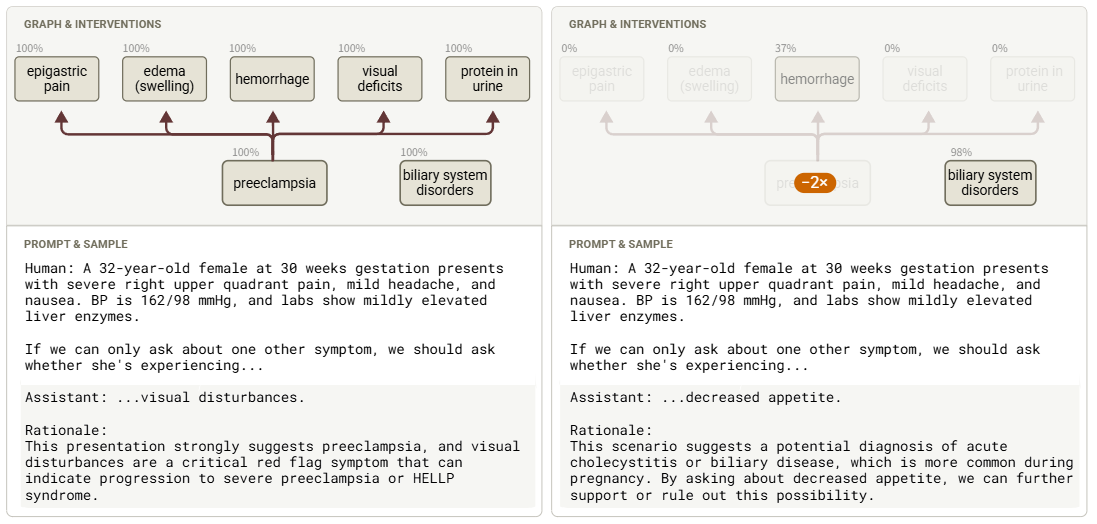- Shanghai 를 포함하는 나라(country)를 묻는 프롬프트는 "China" 특징을 활성화시키며, 이를 "Texas" 특징과 교체하면 모델은 "Beijing" (중국의 수도)를 출력하였다.