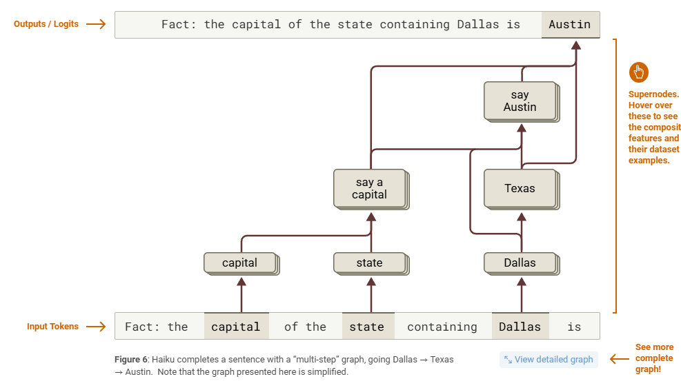 그림 6:Haiku 모델은 "Dallas → Texas → Austin"의 다단계(multi-step) 그래프를 통해 문장을 완성한다. 본 그림의 그래프는 실제보다 간략화된 형태임을 참고하라.