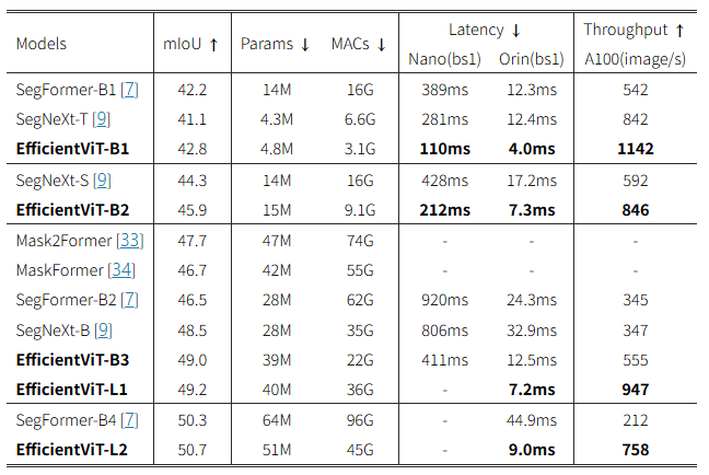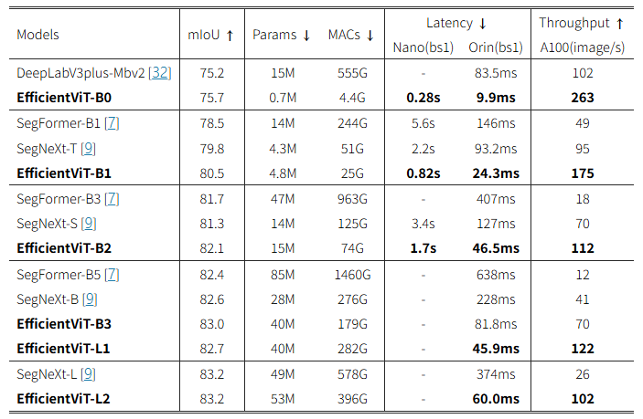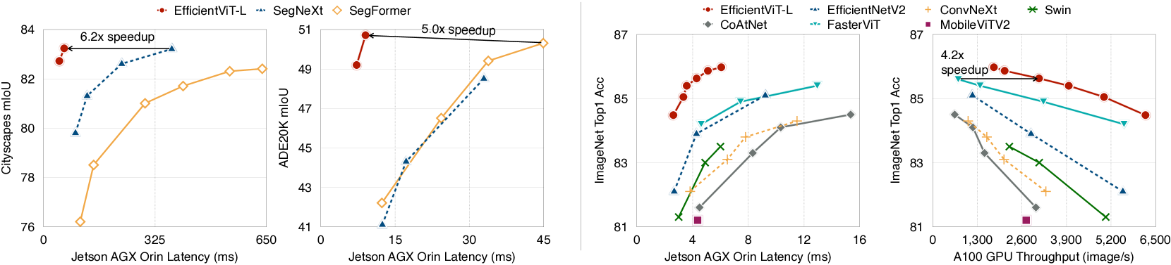 다양한 하드웨어 플랫폼(Jetson AGX Orin, A100 GPU)에서 TensorRT와 FP16으로 추론 시, EfficientViT는 기존 분할/분류 모델 대비 뛰어난 성능을 유지하면서도 지속적으로 향상된 속도를 보여줍니다.
