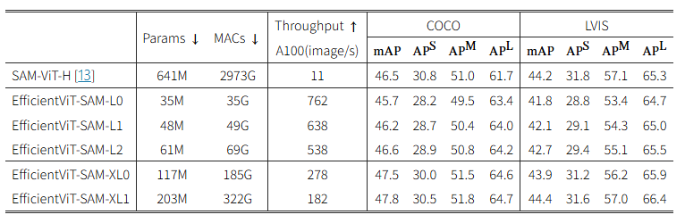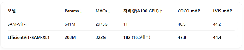 - 특히 EfficientViT-SAM-XL1 모델은 COCO와 LVIS에서 SAM-ViT-H를 능가하며, A100 GPU에서 처리량(throughput)이 16.5배 더 높습니다.