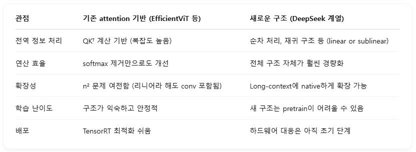 - 하지만 **attention이라는 개념 자체를 벗어나는 구조 (DeepSeek, Hyena)**는