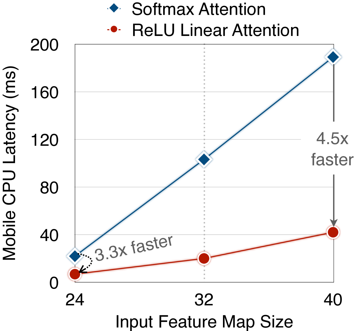 ReLU 선형 어텐션은 softmax보다 3.3~4.5배 빠른 속도를 기록하였으며, Qualcomm Snapdragon 855 CPU + TensorFlow Lite에서 실측하였습니다.