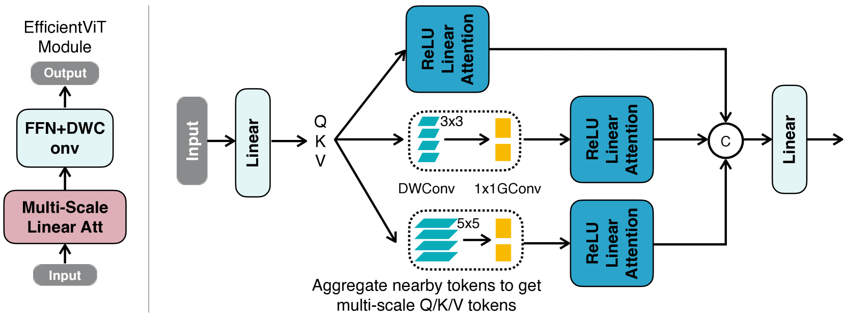 좌측: EfficientViT는 다중 스케일 선형 어텐션 + depthwise convolution이 결합된 FFN으로 구성됩니다.