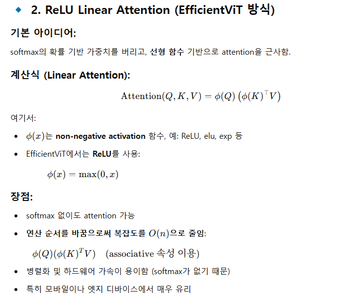 EfficientViT는 기본적으로 ViT-style이지만, softmax 대신 ReLU attention만 교체한 형태였죠.