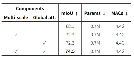 → 다중 스케일 학습과 글로벌 수용 영역이 시맨틱 분할 성능 향상에 필수적임을 확인할 수 있음.