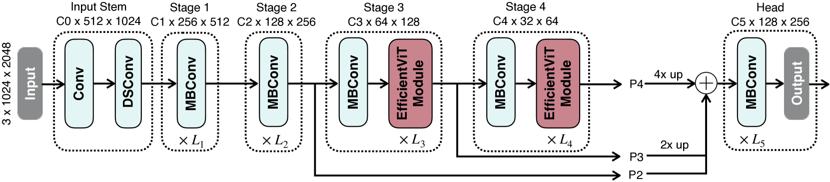 표준 backbone-head (encoder-decoder) 구조를 따르며, EfficientViT 모듈은 stage 3, 4에 삽입됩니다. 마지막 세 단계(P2, P3, P4)의 피처들을 단순히 더해(head) 출력으로 활용합니다.