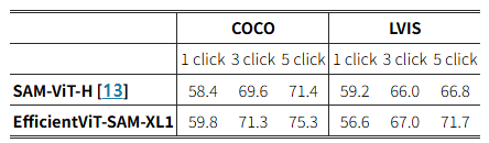 - EfficientViT-SAM은 기존의 가속화된 SAM 모델 중 최초로 SAM-ViT-H의 제로샷 성능을 달성하거나 능가