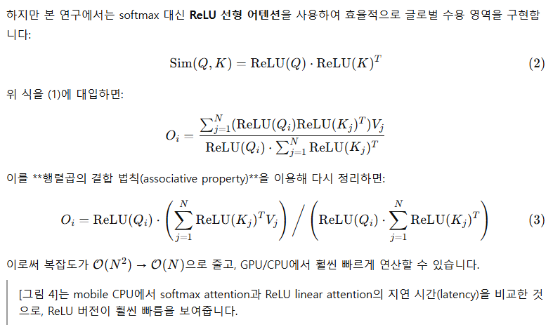 구체적으로, softmax 어텐션을 경량화된 ReLU 기반 선형 어텐션(ReLU linear attention)으로 대체하여 글로벌 수용 영역을 확보합니다.
