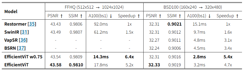 - EfficientViT는 시맨틱 분할, 초해상도, Segment Anything, ImageNet 분류 등 다양한 과제에서 기존 SOTA 모델 대비 획기적인 속도 향상을 달성했습니다. 또한 모바일 CPU, 엣지 GPU, 클라우드 GPU 등 다양한 하드웨어 플랫폼에서 우수한 성능을 보였습니다.