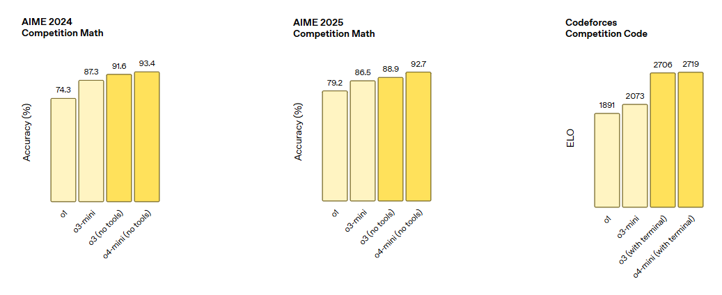 실제 활용에서 o3 / o4‑mini ▶ o1 / o3‑mini보다 대체로 더 높은 정확도와 더 낮은 실행 비용을 동시에 제공할 것으로 예상됩니다. - 사례: 2025 AIME