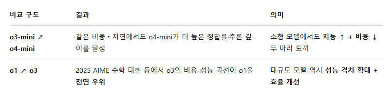 동일 비용 구간에서 o3가 o1을 완전히 능가해, “더 싸고 더 똑똑한” 새로운 전면(Frontier)을 형성했습니다. o4‑mini도 o3‑mini 대비 같은 패턴을 보여 줍니다. - 실무에 주는 시사점