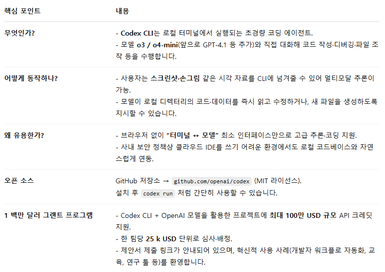 요약: Codex CLI는 “모델 → 내 컴퓨터” 연결을 극도로 간소화해, 강력한 추론 능력을 코드 작성·분석 워크플로에 즉시 불어넣어 줍니다. 오픈 소스 프로젝트이므로 자유롭게 확장·기여할 수 있으며, 혁신적 활용 아이디어가 있다면 그랜트 프로그램으로 자금·API 크레딧 지원까지 노려보세요.