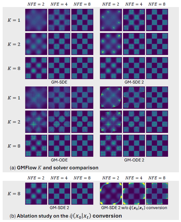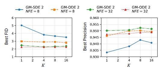- Few‑step 샘플링(NFE = 8)에서는, 특히 GM‑SDE 2 솔버 사용 시 K를 늘릴수록 성능 향상이 가장 뚜렷하다.