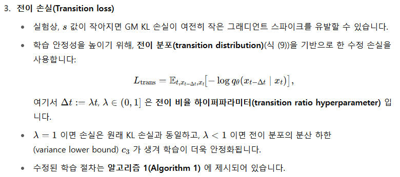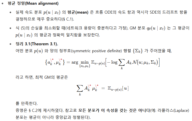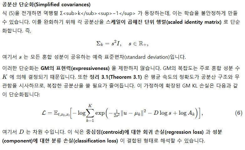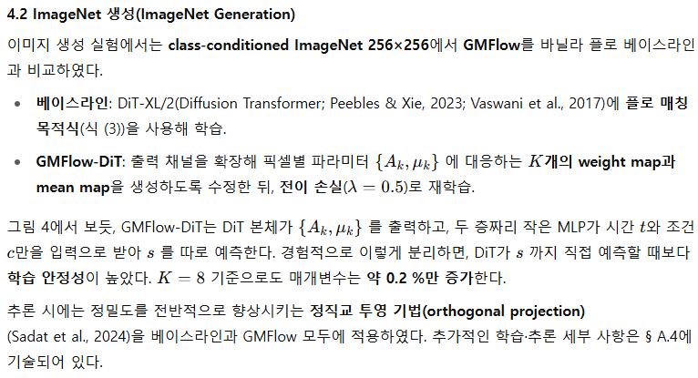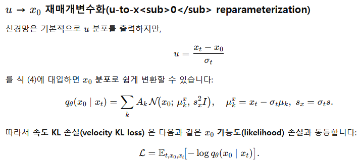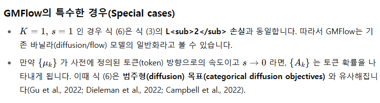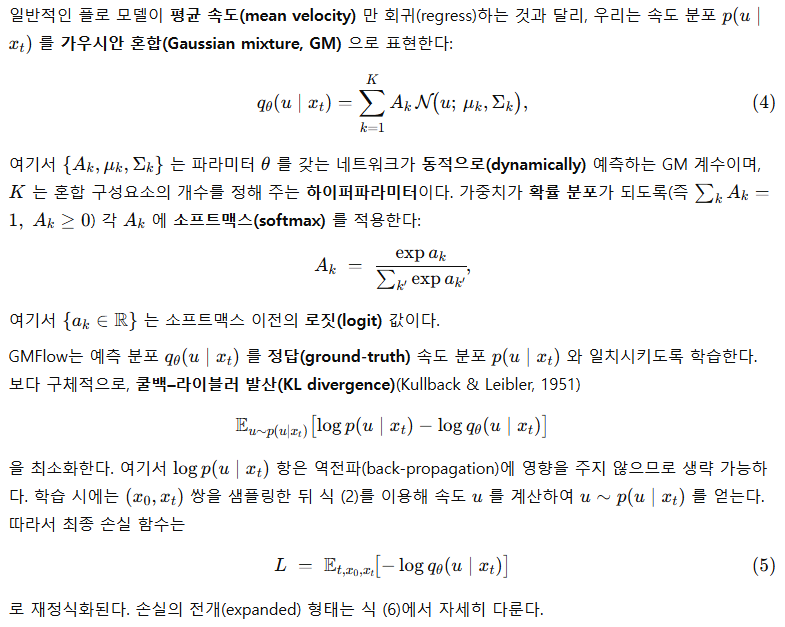 - 학습: GMFlow는 KL 발산 손실(KL divergence loss) 로 예측한 속도 분포와 실제 분포를 정합시킨다. 이는 기존 확산·흐름 매칭 모델(L2 잡음 제거 손실)보다 일반화된 형태임을 § 3.1에서 보인다.