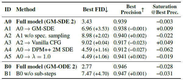 - GM‑ODE 2: 서브‑스텝 없이 ODE 적분을 바로 적용(B1)하면 FID가 크게 나빠진다.