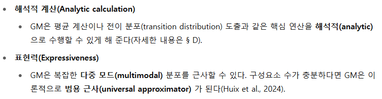 확산 모델을 넘어, 가우시안 혼합(Gaussian mixture) 은 다른 생성 모델에도 활용된다. DeLiGAN(Gurumurthy et al., 2017)과 GM‑GAN(Ben‑Yosef & Weinshall, 2018)은 GAN의 잠재 공간(latent space)에 혼합 사전(mixture prior)을 도입해 표현력을 높인다. GIVT(Tschannen et al., 2024)는 오토리그레시브 트랜스포머(autoregressive Transformer) 의 출력을 가우시안 혼합으로 모델링해, 양자화(quantization) 기반 방식보다 뛰어난 성능으로 연속 데이터 샘플링을 가능하게 한다.