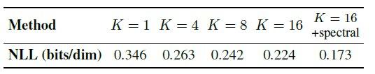 - GMFlow의 경우, 서로 다른 혼합 성분 수 K 를 갖는 여러 모델을 학습하였고(전이 비율 λ=0.9 사용)