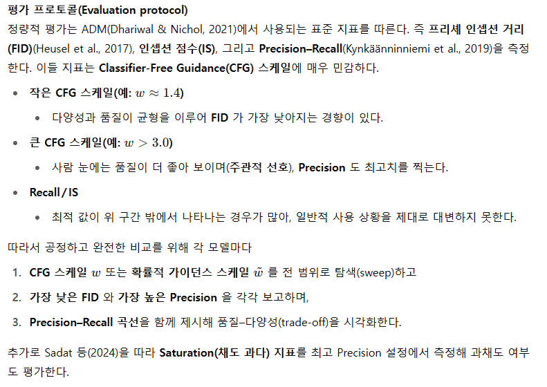 CFG를 단순 임계값(thresholding, Saharia et al., 2022a)이나 정직교 투영(orthogonal projection)(Sadat et al., 2024) 이상으로 개선하려는 시도도 있다. 예를 들어 초기 스텝에서 CFG를 끄기(Kynkäännienmi et al., 2024)는 Precision을 희생시키고, 랑주뱅(Langevin) 보정을 추가하는 방법(Bradley & Nakkiran, 2024)은 효율을 낮춘다.