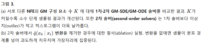 2차 GM 솔버에서 q^(x0∣xt) 변환의 중요성을 검증하기 위해, 이 변환을 제거하고 직전 두 스텝의 x_0 분포만을 직접 외삽(extrapolation)하는 실험을 수행했다(DPM++ 방식과 유사, Lu et al., 2023). 그림 3 (b)에 나타나듯, 변환을 제거하면 샘플이 분포 경계를 넘어서 과도하게 치우치는 오버슈팅(overshooting) 편향이 발생하며, 이는 DPM++ 2M SDE(NFE = 8)와 유사한 현상이다. 결과적으로, 해당 변환이 샘플 균일성 유지에 필수적임을 확인할 수 있다.