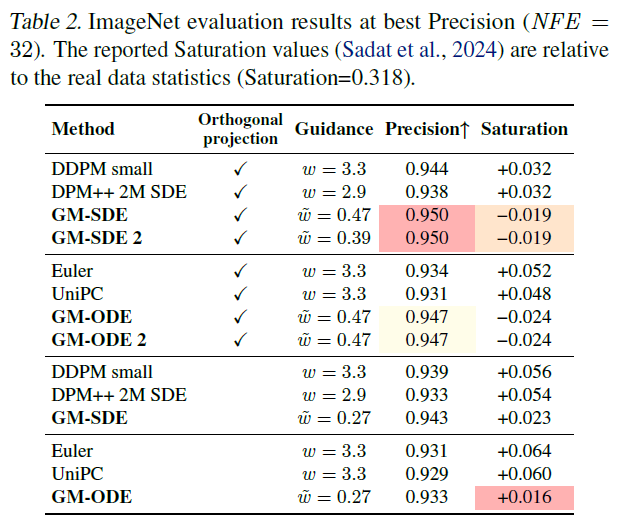 표 2. ImageNet 평가 결과 (최고 Precision, NFE = 32). 보고된 Saturation 값(Sadat et al., 2024)은 실제 데이터의 통계량(기준 Saturation = 0.318)과 비교한 상대 지표이다.