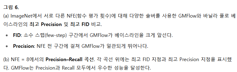 - FID: 소수 스텝(NFE ≤ 8) 구간에서는 GMFlow가 베이스라인보다 확연히 우수하며, 다수 스텝(NFE ≥ 32) 구간에서도 경쟁력을 유지했다.