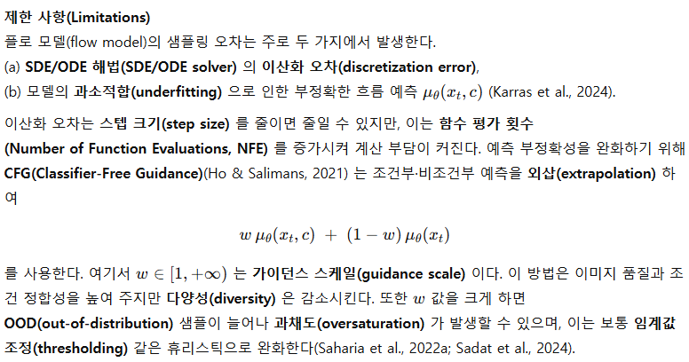 그러나 일반 확산·흐름 모델은 높은 품질의 생성을 위해 수십 단계의 샘플링이 필요하다. 이는 가우시안 근사가 작은 스텝 크기에서만 성립하고, 수치적 ODE 적분 과정에서 이산화(discretization) 오차가 발생하기 때문이다. 또한 고품질 생성을 위해서는 분류기 프리 가이던스(Classifier‑Free Guidance, CFG) 스케일을 크게 하는 것이 일반적이지만(Ho & Salimans, 2021), 스케일을 과도하게 키우면 과채도(oversaturated) 색상이 나타난다(Saharia et al., 2022a; Kynkäännienmi et al., 2024). 이는 분포 밖 외삽(out‑of‑distribution extrapolation) 현상(Bradley & Nakkiran, 2024) 때문이며, 수백 스텝을 사용해도 전체 이미지 품질을 제한한다.