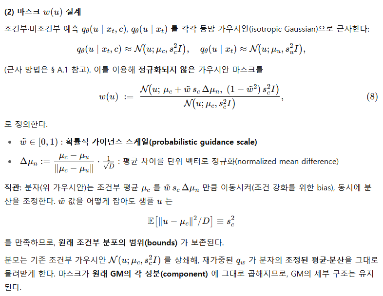 동시에 확률적 가이던스(probabilistic guidance) 기법을 고안해, 조건 정합성을 높이도록 GM PDF를 가우시안 마스크로 재가중한다(§ 3.2).