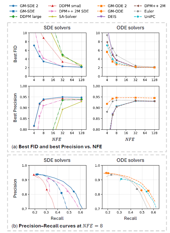그림 6 (a)는 2차 GM 솔버(GM‑SDE/ODE 2) 를 장착한 GMFlow(K = 8) 와 위 베이스라인들을 비교한 결과이다.