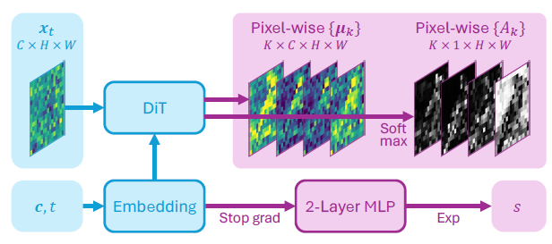 그림 4. GMFlow‑DiT의 아키텍처. 원본 DiT(Peebles & Xie, 2023)는 파란색으로, 수정된 출력 레이어는 보라색으로 표시되어 있다.
