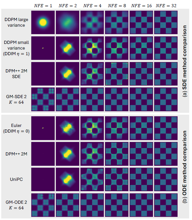 그림 3 (a)에서는 서로 다른 NFE(Number of Function Evaluations)와 GM 성분 개수 K 에 대해 1차(왼쪽 열)와 2차(오른쪽 열) GM 솔버를 비교한다. 2차 솔버는 1차 솔버보다 히스토그램이 더욱 뚜렷하고 이상치(outlier)를 효과적으로 억제하며, 특히 NFE와 K가 작을 때 그 차이가 두드러진다. 반면 K=8 이상이면 GM 확률이 이미 충분히 정확해 2차 솔버가 추가적인 이점을 보이지 않으며, 이는 우리의 이론적 분석과 일치한다.