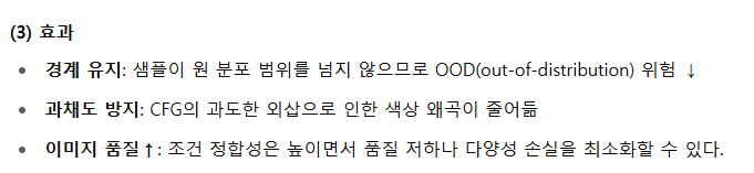 - CFG 는 “조건(예: 텍스트, 클래스 라벨)을 더 강하게 반영해!” 하고 모델 출력을 섞어서(외삽) 이미지를 개선하는 방법입니다.