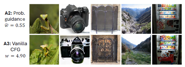 그림 8. 확률적 가이던스 절삭 실험.표 4의 A2(스펙트럴 샘플링 포함)과 A3(바닐라 CFG 대체) 샘플 비교.